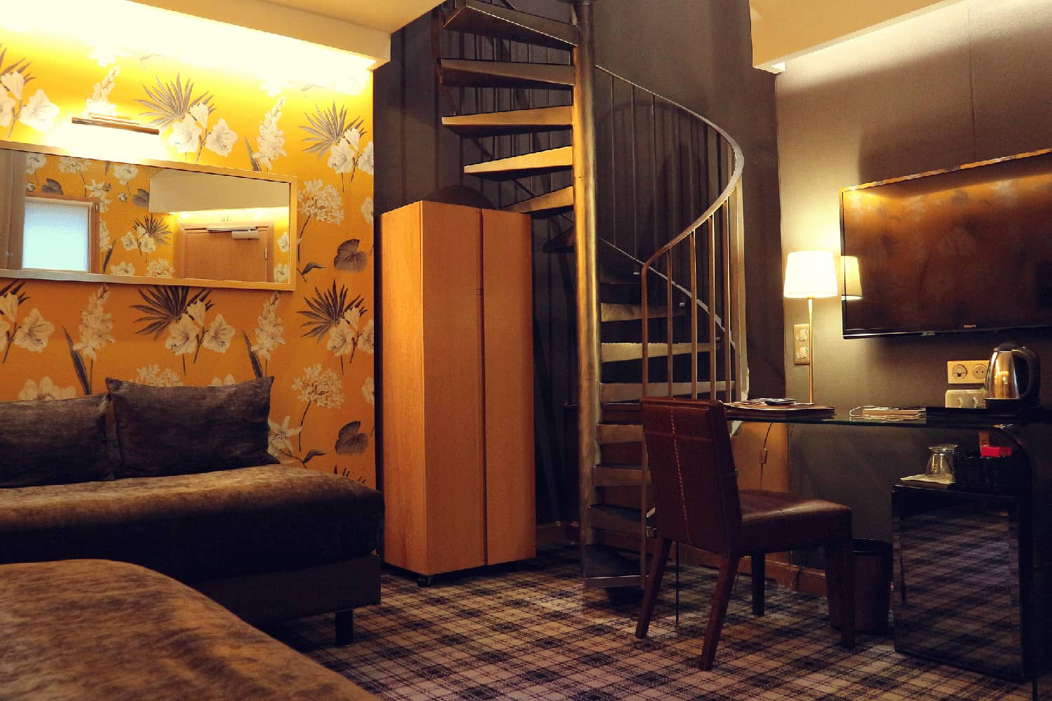 Grande chambre sur deux niveaux avec un lit double, salle de bains avec douche, toilettes séparées en mezzanine